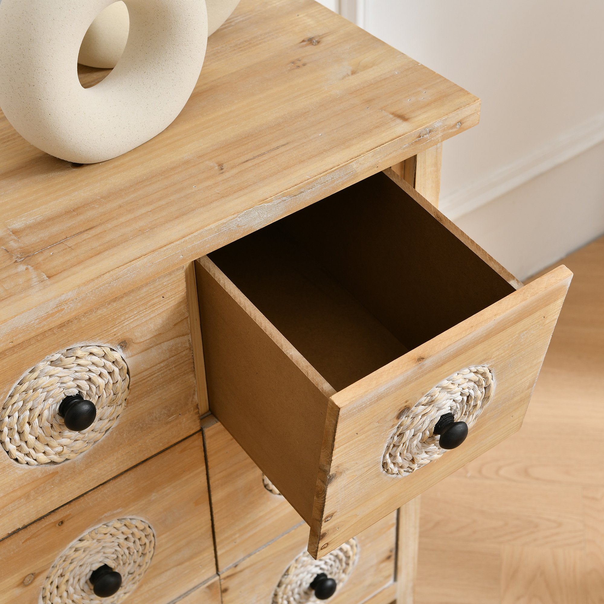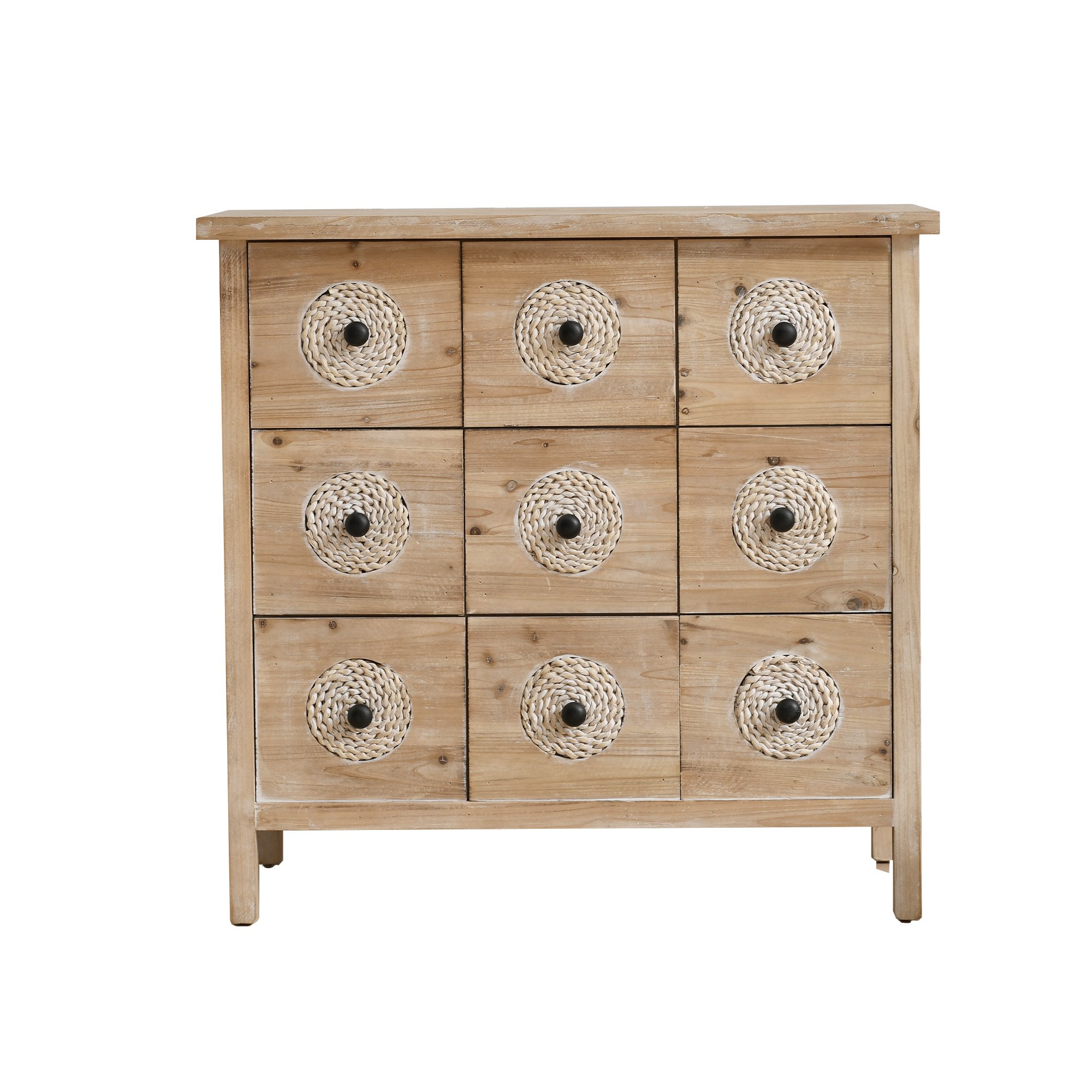 Bring the rustic charm with this vintage apothecary-style 9-drawer chest that provides convenient storage solutions for your phone, remotes, devices, reading glasses, and other items to be kept within reach. From bedside to sofa or chair side, the table is the ideal accent piece for your decor. Each drawer facing features circular rattan patterns. Constructed using fir and manufactured wood, the charming side table goes well with most design choices, and will make a great addition to your living room, bedroom, or guest room, or as a functional accent piece in your entryway or foyer.