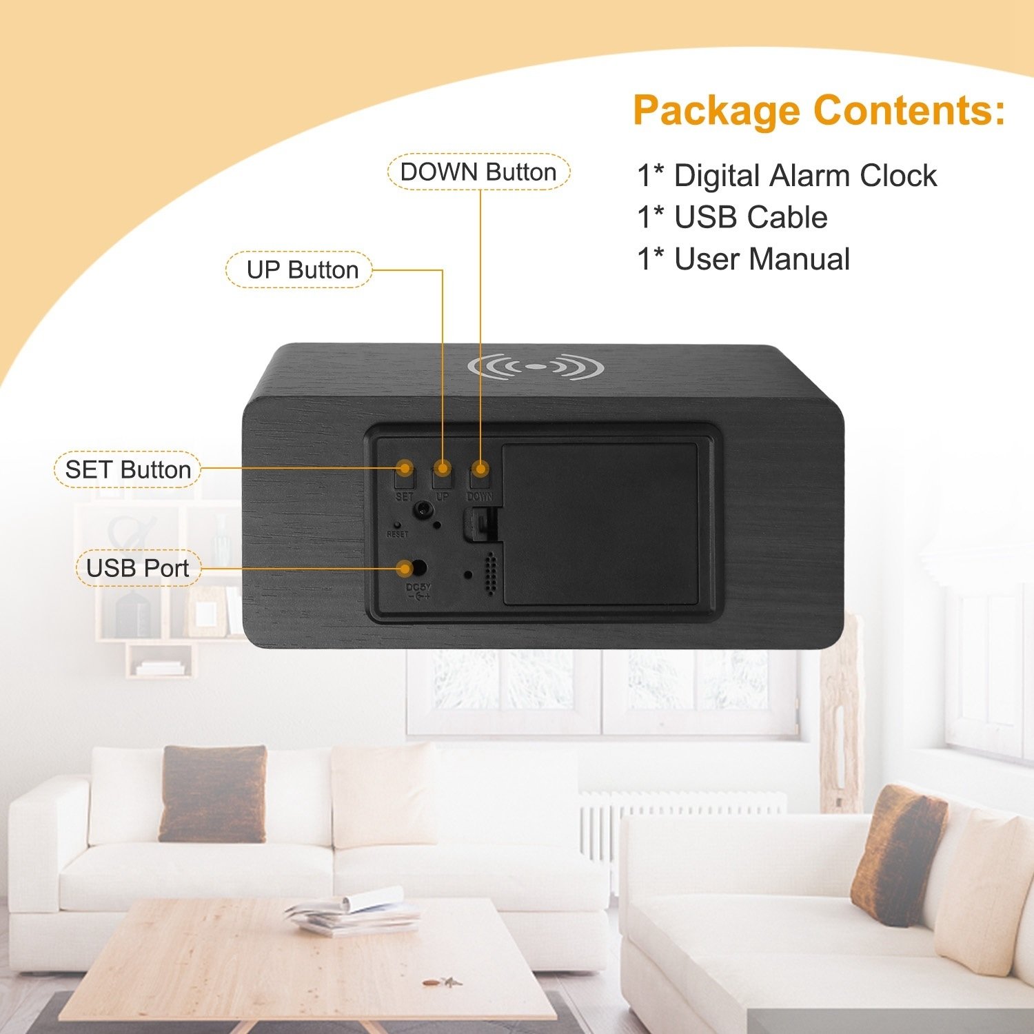 Home > Digital Alarm Clock Qi-Wireless Charger Time Temperature Calendar Display Clock w/ Voice Control Brightness Adjustment